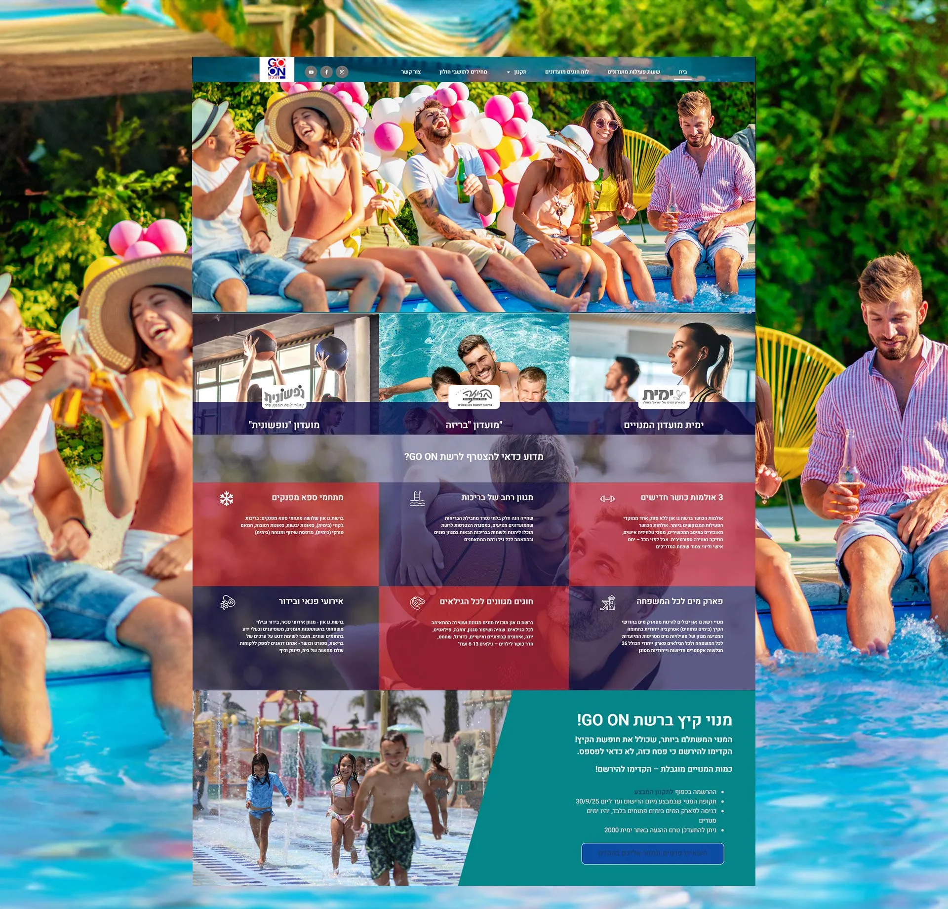אתר GO ON מציג את מנוי מולטי קלאב - מנוי אחד לשלושה מרכזי קאנטרי קלאב מפנקים ופארק המים הטוב במדינה: ימית, בריזה ונופשונית. במסגרת המנוי תוכלו ליהנות משלושה חדרי כושר עם מיכשור מתקדם וייחודי, מבריכות מקורות ומחוממות בחודשי החורף, מבריכות קיציות, מבריכות לפעוטות ומבילוי בפארק המים המוביל במדינה. ובנוסף, תיהנו ממגוון רחב של חוגים לילדים ולמבוגרים ומשלל אירועי פנאי, תרבות ופעילויות לכל הגילאים.